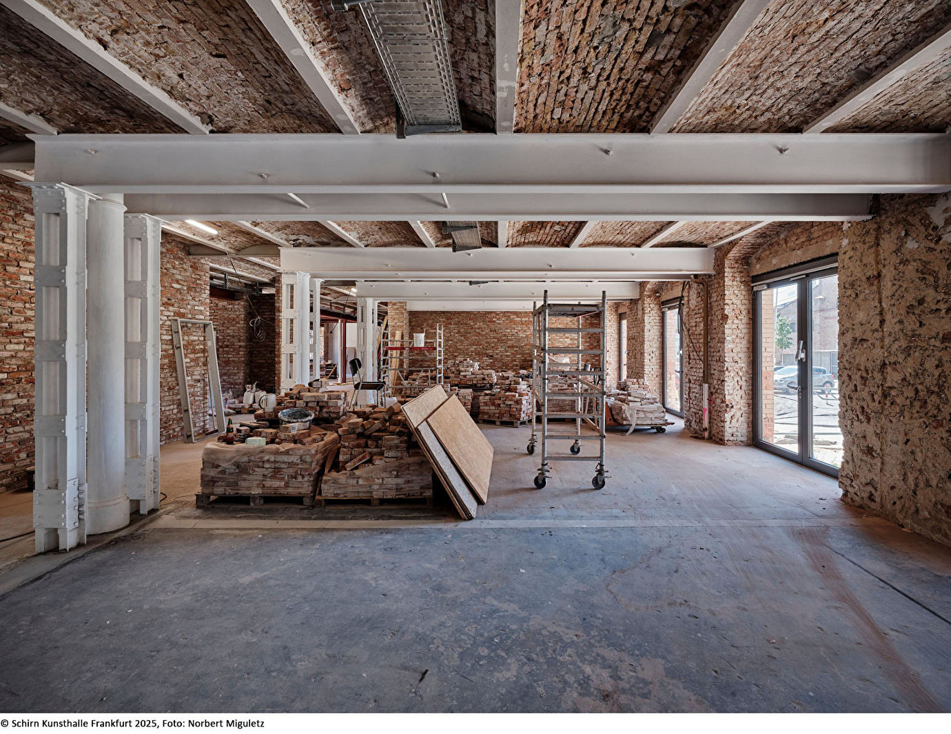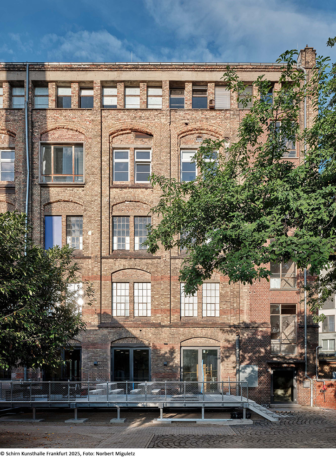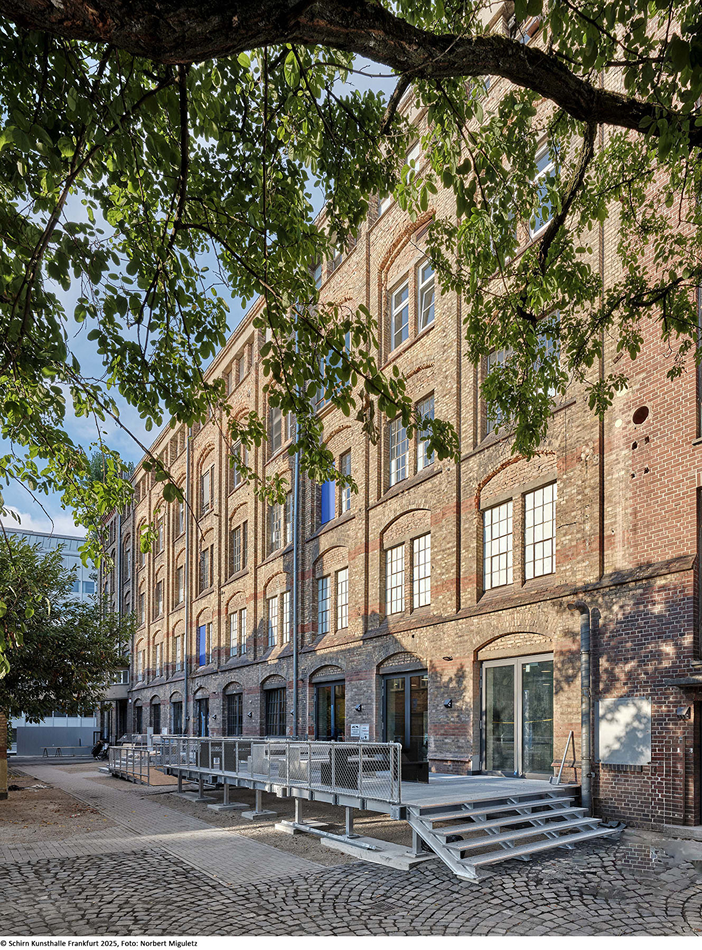 Um die Verbindung zum Bockenheimer Depot und zum Quartier zu stärken, wurde der Haupteingang auf die Westseite des Hauptgebäudes verlegt. Im Erdgeschoss verbinden offene Raumkonzepte Café, Foyer und Hof, während die Obergeschosse flexible Flächen für Ausstellungen, Initiativen und Büronutzung bieten. Historische Substanz wie Stahlträger, gusseiserne Stützen, Türen und Mauerwerk wurde freigelegt, ertüchtigt und wiederverwendet, neue Elemente fügen sich sensibel in die bestehende Bausprache ein.