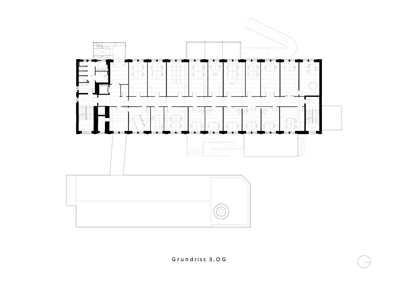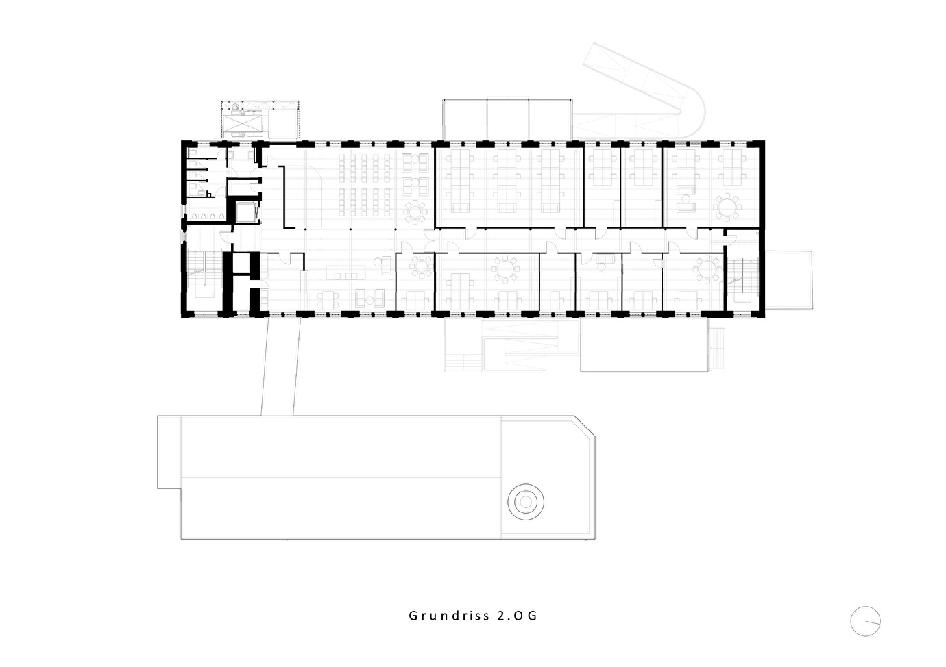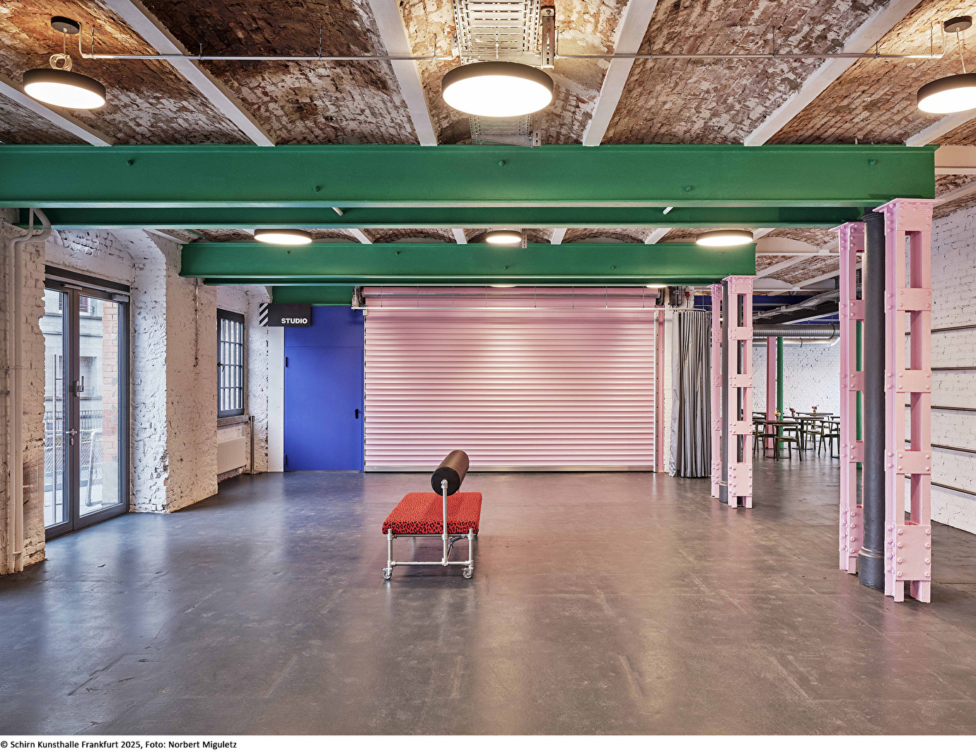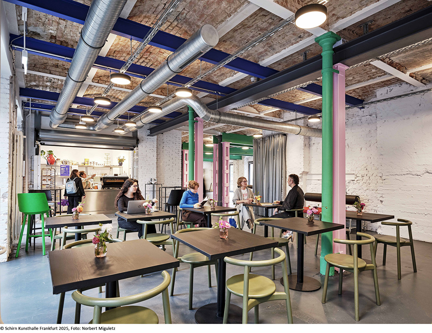 Um die Verbindung zum Bockenheimer Depot und zum Quartier zu stärken, wurde der Haupteingang auf die Westseite des Hauptgebäudes verlegt. Im Erdgeschoss verbinden offene Raumkonzepte Café, Foyer und Hof, während die Obergeschosse flexible Flächen für Ausstellungen, Initiativen und Büronutzung bieten. Historische Substanz wie Stahlträger, gusseiserne Stützen, Türen und Mauerwerk wurde freigelegt, ertüchtigt und wiederverwendet, neue Elemente fügen sich sensibel in die bestehende Bausprache ein.