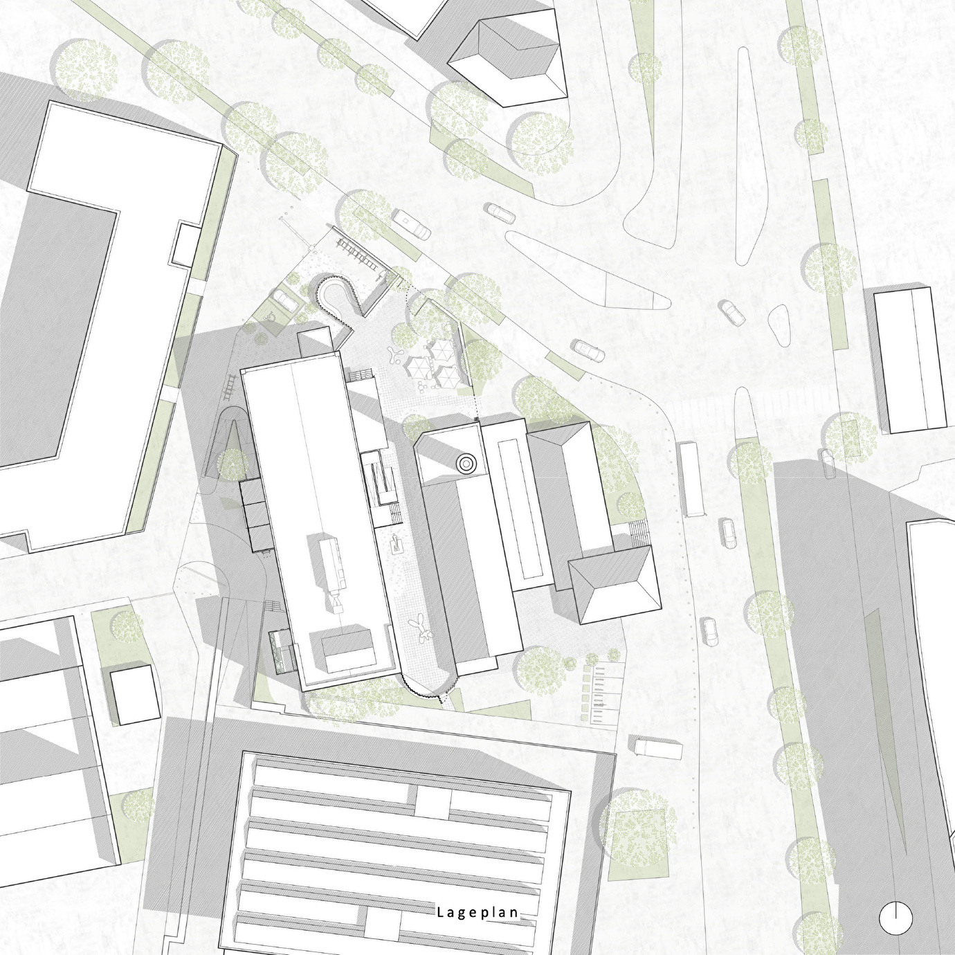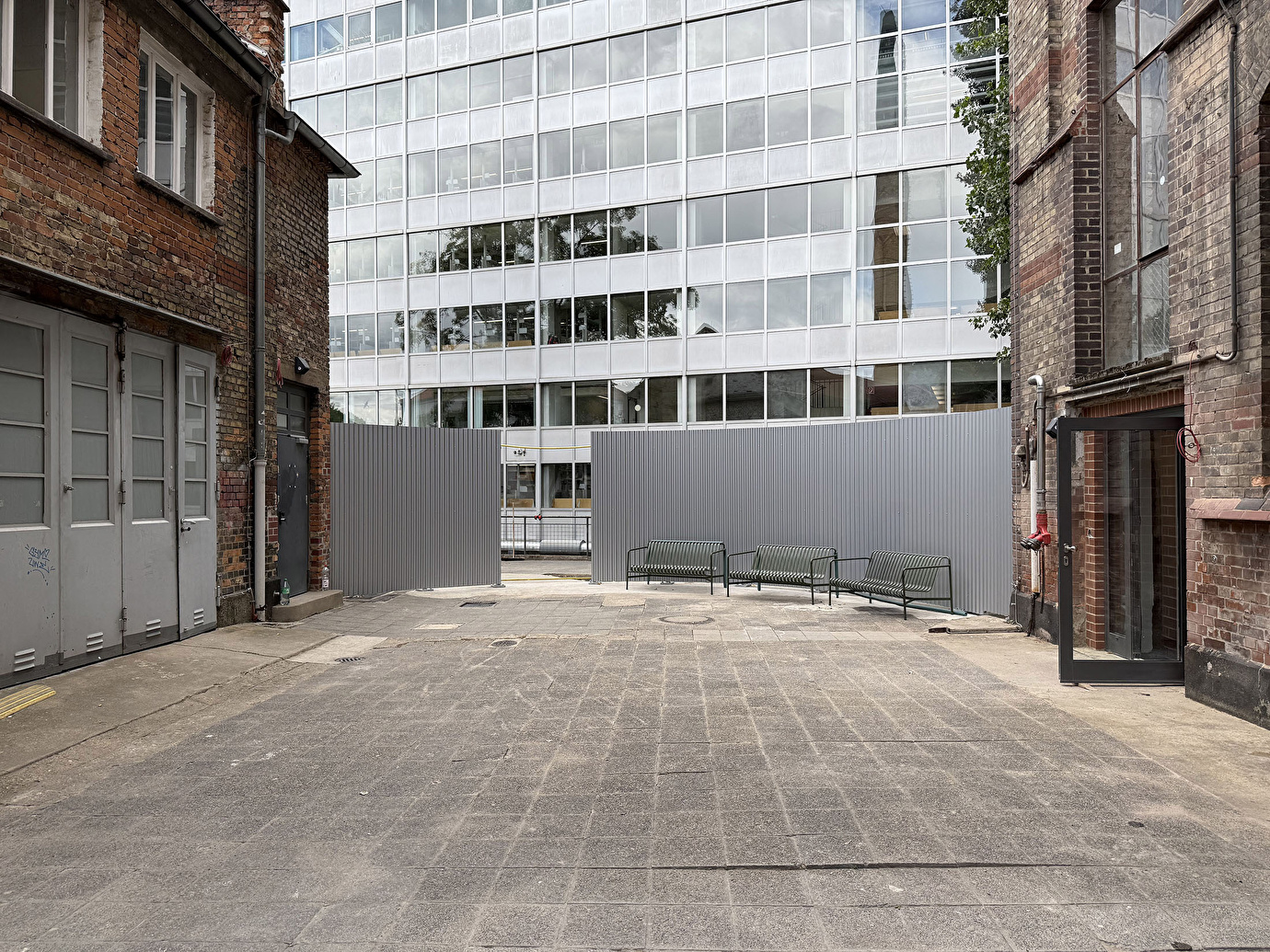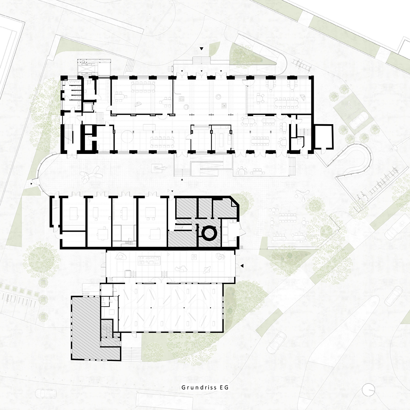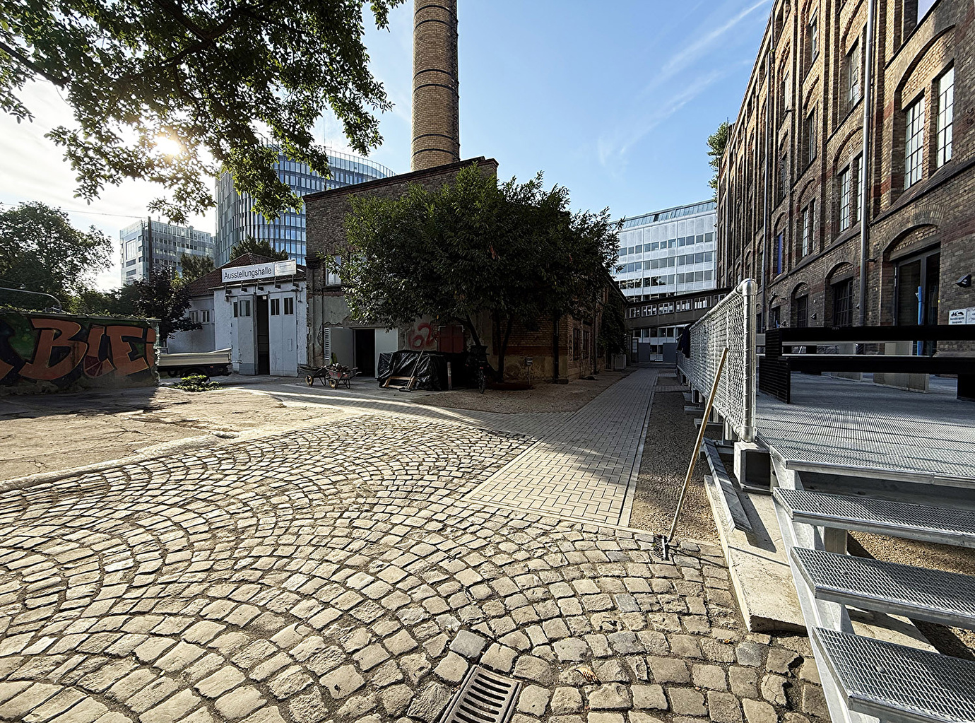 Auch die Freiräume wurden behutsam aufbereitet: barrierefreie Wege, Wiederverwendung bestehenden Basaltsteinpflasters, punktuelle Bepflanzung und erhaltene Bäume schaffen eine neue Aufenthaltsqualität.